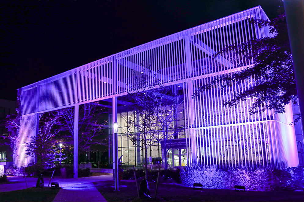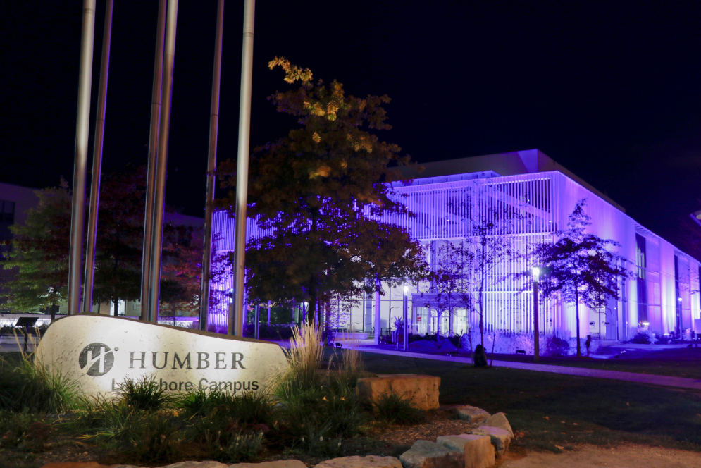 The Welcome Centre at Humber's Lakeshore Campus lit up in vibrant blue and purple lights to raise awareness for disability employment. Students and staff captured the moment and shared their photos on social media using #NDEAM and tagging @humbercareer.